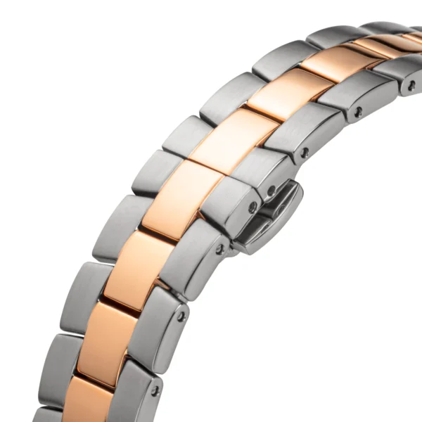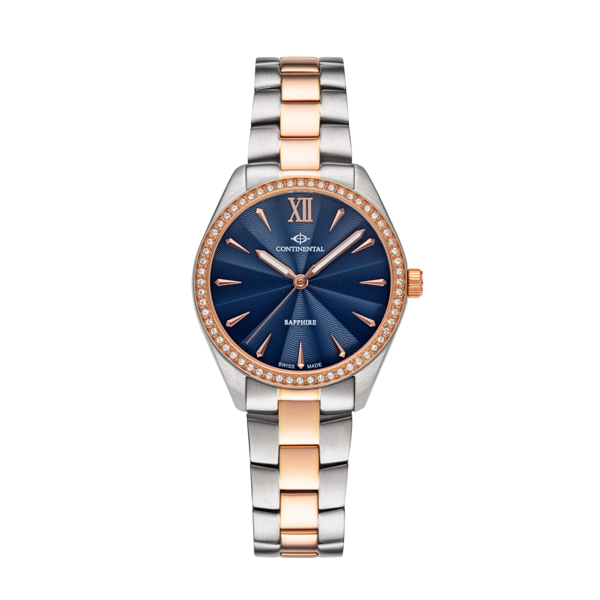 This stylish CONTINENTAL Ladies Blue Dial Two Tone Rose Gold Steel Bracelet Dress Watch 22508.LT815831, with a classic round case shape, is the ideal accessory for the fashionable lady. Part of the ‘Trend’ collection, this Two Tone Rose Gold Stainless Steel Swiss Made Luxury Watch for women has Swarovski crystals set on the bezel. In addition, it has a stunning Blue dial with luminous stainless steel hands and hour markers. Furthermore, this Blue Dial Women’s watch has a scratch-resistant Sapphire crystal and a stainless steel case back.