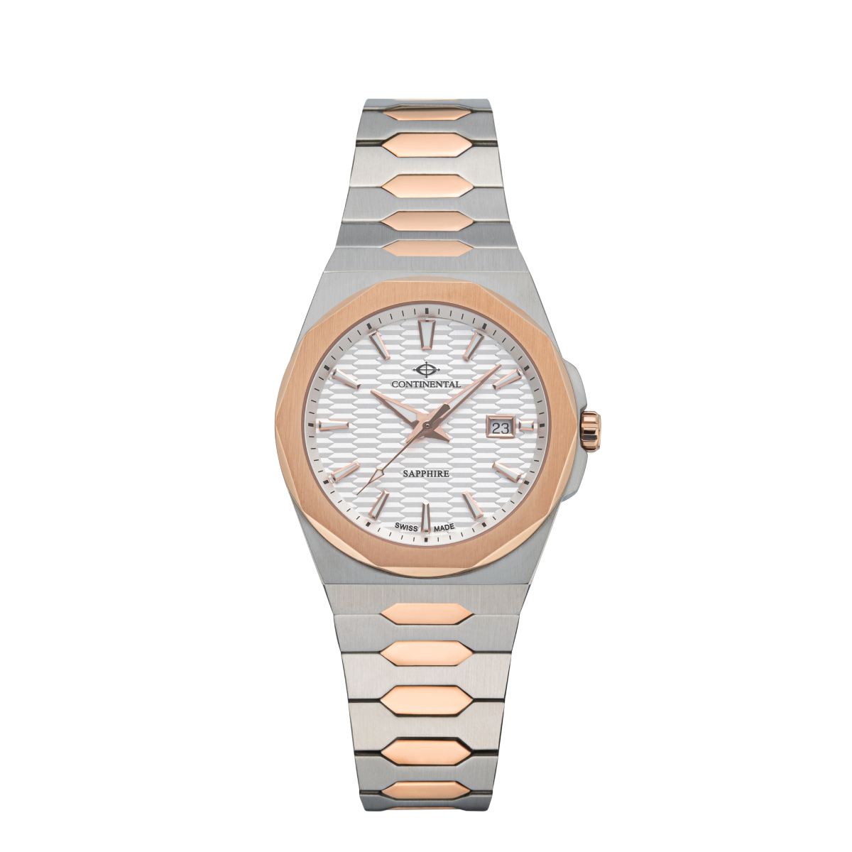 A stylish CONTINENTAL Ladies Dress watch in Two Tone Rose Gold Stainless Steel, with a striking Silver dial, Date window and luminous hands & hour markers.