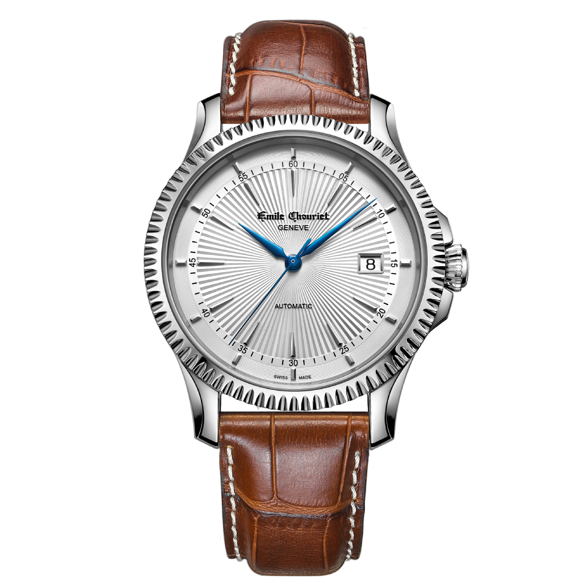 The EMILE CHOURIET Ailes du Temps Dress Watch is an elegant Automatic timepiece in Stainless Steel with a White dial and Brown leather strap, a fluted Bezel, Blued Steel Hands and Date window.