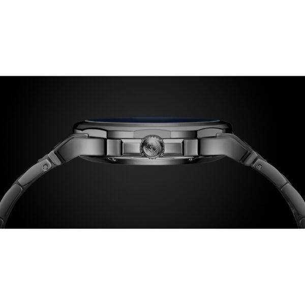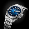 This Men’s Automatic Sports Watch has a durable stainless steel case in a round shape with a satin finish. The Swiss Made Luxury Watch for Men is a Men’s Stainless Steel Watch graduated Sunray Blue dial has applied batons and Roman numerals with SuperLumiNova. In addition, the stainless steel Hour and Minute hands are in a ‘tuning fork‘ inspired design and have SuperLumiNova. Additionally, the centrally positioned Seconds hand is stainless steel with a Black and Orange PVD coating, with SuperLumiNova. Furthermore, the watch has a scratch-resistant Sapphire crystal and a Date window at the 3 o’clock position. Finally, this watch has a stainless steel bracelet with a butterfly buckle and push buttons for extra security.
