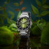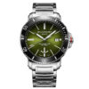 This Men’s Automatic Sports Watch has a durable stainless steel case in a round shape and a screw-down Crown protected by crown guards. In addition, it has a Black inlaid Ceramic unidirectional rotating Bezel. This watch has a stunning graduated Lime Green dial with a Sunray effect finish. In addition, the dial has luminous Batons and a Date window at the 3 o’clock position. The stainless steel Hour and Minute hands are in a ‘syringe‘ design and have SuperLumiNova. In addition, the stainless steel Seconds hand has a Red PVD coated tip. Furthermore, the watch has a scratch-resistant Sapphire crystal and a solid stainless steel case back with an anchor design. Finally, this watch has a stainless steel bracelet with a butterfly buckle and push buttons for extra security.