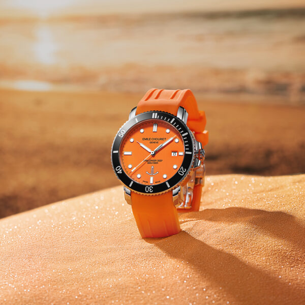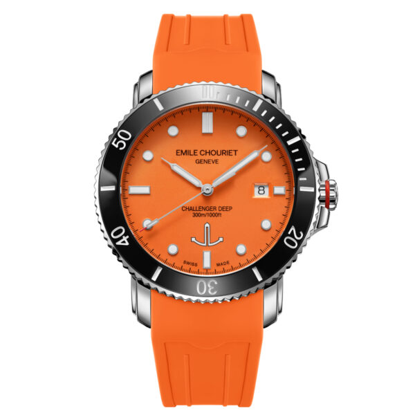 The EMILE-CHOURIET Challenger Deep Dive Watch is a stylish Automatic timepiece in Stainless Steel with an Orange dial, matching Orange Rubber strap, SuperLumiNova, Black Ceramic Rotating Bezel & Date.