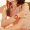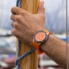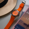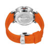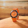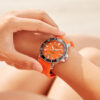 This Men’s Automatic Sports Watch is a Men’s Stainless Steel Watch has a durable stainless steel case in a round shape and a screw-down Crown protected by crown guards. In addition, it has a Black inlaid Ceramic unidirectional rotating Bezel. This watch has a bright Orange dial with a Matt effect finish. In addition, the dial has luminous Batons and Circles, and a Date window at the 3 o’clock position. The stainless steel Hour and Minute hands are in a ‘syringe‘ design and have SuperLumiNova. In addition, the stainless steel Seconds hand has a Red PVD coated tip. Furthermore, the watch has a scratch-resistant Sapphire crystal and a solid stainless steel case back with an anchor design. Finally, this watch has an Orange rubber strap with a stainless steel butterfly buckle and push buttons for extra security.