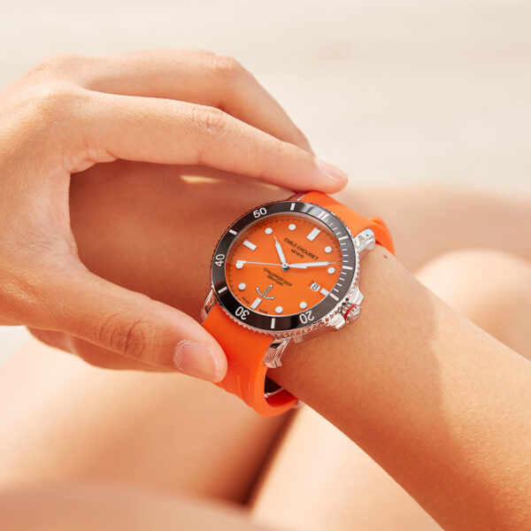 The EMILE-CHOURIET Challenger Deep Gent’s Orange Dial Orange Silicone Strap Automatic Dive Watch 08.1169.G.6.AW.F3.8 will arrive in an EMILE CHOURIET brand watch box. In addition, it comes with a five year international warranty from the manufacturer. EMILE CHOURIET is an established and independent Swiss watch manufacturer, launched in 1998, in Geneva. For more information on the watch brand, please visit the manufacturer’s website. Furthermore, you can view our dedicated EMILE CHOURIET brand page for more designs from this brand.