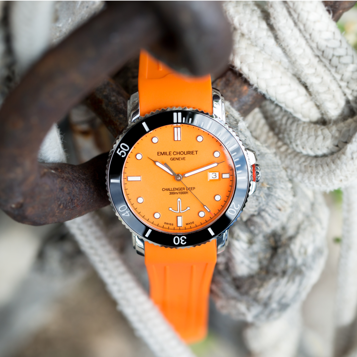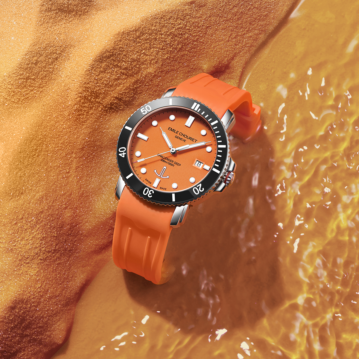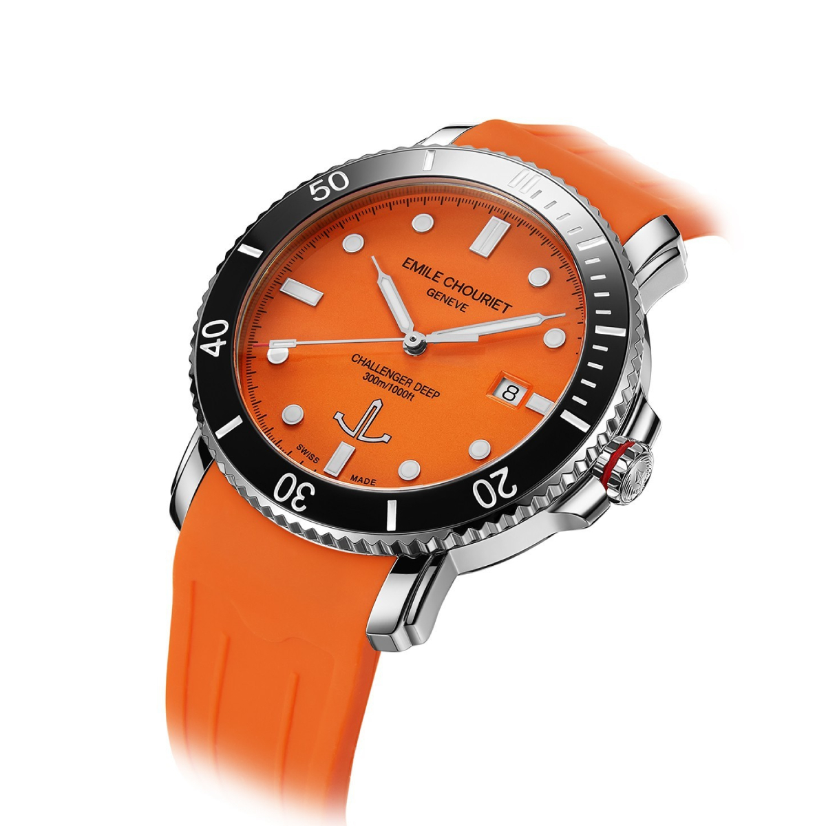 The EMILE-CHOURIET Challenger Deep Dive Watch is a stylish Automatic timepiece in Stainless Steel with an Orange dial, matching Orange Rubber strap, SuperLumiNova, Black Ceramic Rotating Bezel & Date.