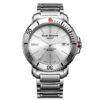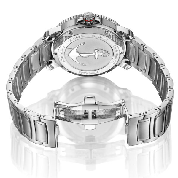 This Men’s Automatic Sports Watch is a Men’s Stainless Steel Watch and has a durable stainless steel case in a round shape and a screw-down Crown protected by crown guards. In addition, it has a stainless steel unidirectional rotating Bezel. This watch has a versatile Silver dial with a Sunray effect finish. In addition, the dial has luminous Batons and a Date window at the 3 o’clock position. The stainless steel Hour and Minute hands are in a ‘syringe‘ design and have SuperLumiNova. In addition, the stainless steel Seconds hand has a Red PVD coated tip. Furthermore, the watch has a scratch-resistant Sapphire crystal and a solid stainless steel case back with an anchor design. Finally, this watch has a stainless steel bracelet with a butterfly buckle and push buttons for extra security.