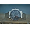 This Swiss Made Luxury Watch is a Men’s Automatic Dress Watch. The watch has a durable Stainless Steel Case in a round shape and the Chronograph pushers flank the Crown. The stunning Dark Grey dial has a Sunray effect finish and a Tachymeter on the outer ring. In addition, there is a Date window at the 4 o’clock position. Furthermore, there are three sub-dials for the Chronograph Minutes, Small Seconds and Power Reserve indicator. The dial has Stainless Steel Hour and Minute hands in a ‘leaf‘ design. In addition, the applied Batons and centrally positioned Chronograph Seconds hand is also Stainless Steel. Furthermore, the watch has a scratch-resistant Sapphire crystal. Finally, this watch has a Stainless Steel bracelet with a butterfly buckle and push buttons for extra security.