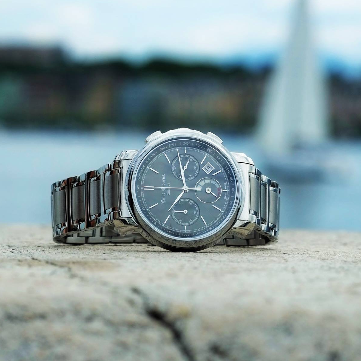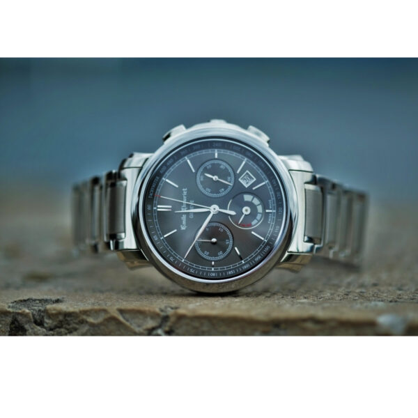 The EMILE CHOURIET Lac Leman Chronograph Dress Watch is a stunning Automatic timepiece in Stainless Steel with a Dark Grey dial, SuperLumiNova, Tachymeter, Power Reserve & Date indicator.