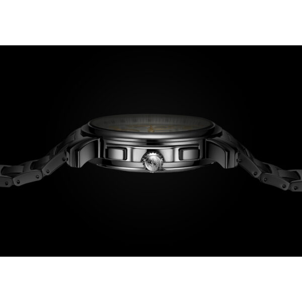 This Swiss Made Luxury Watch is a Men’s Automatic Dress Watch. The watch has a durable Stainless Steel Case in a round shape and the Chronograph pushers flank the Crown. The stunning Silver dial has a Sunray effect finish and a Tachymeter on the outer ring. In addition, there is a Date window at the 4 o’clock position. Furthermore, there are three sub-dials for the Chronograph Minutes, Small Seconds and Power Reserve indicator. The dial has Yellow Gold PVD coated Stainless Steel Hour and Minute hands in a ‘leaf‘ design. In addition, the dial has Yellow Gold PVD coated Stainless Steel Batons and a centrally positioned Chronograph Seconds hand. Furthermore, the watch has a scratch-resistant Sapphire crystal. Finally, this watch has a Stainless Steel bracelet with a butterfly buckle and push buttons for extra security.