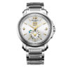 This Swiss Made Luxury Watch for Men has a durable Stainless Steel Case in a round shape and crown guards flank the Crown. The stunning Men’s Stainless Steel Watch has a Silver dial has a Sunray effect finish and Minute markers on the outer ring. In addition, there is a Big Date window below the 12 o’clock hour marker and brand logo. Furthermore, there is a sub-dial at the 6 o’clock position for the Second Time Zone display and a Day/Night indicator. The dial has Yellow Gold PVD coated Stainless Steel Hour, Minute and Second hands in a ‘leaf‘ design. In addition, the dial has Yellow Gold PVD coated Stainless Steel Arabic numerals and Batons. Furthermore, the watch has a scratch-resistant Sapphire crystal. Finally, this watch has a stainless steel bracelet with a butterfly buckle and push buttons for extra security.