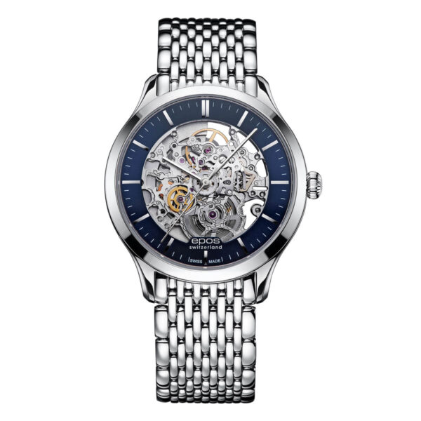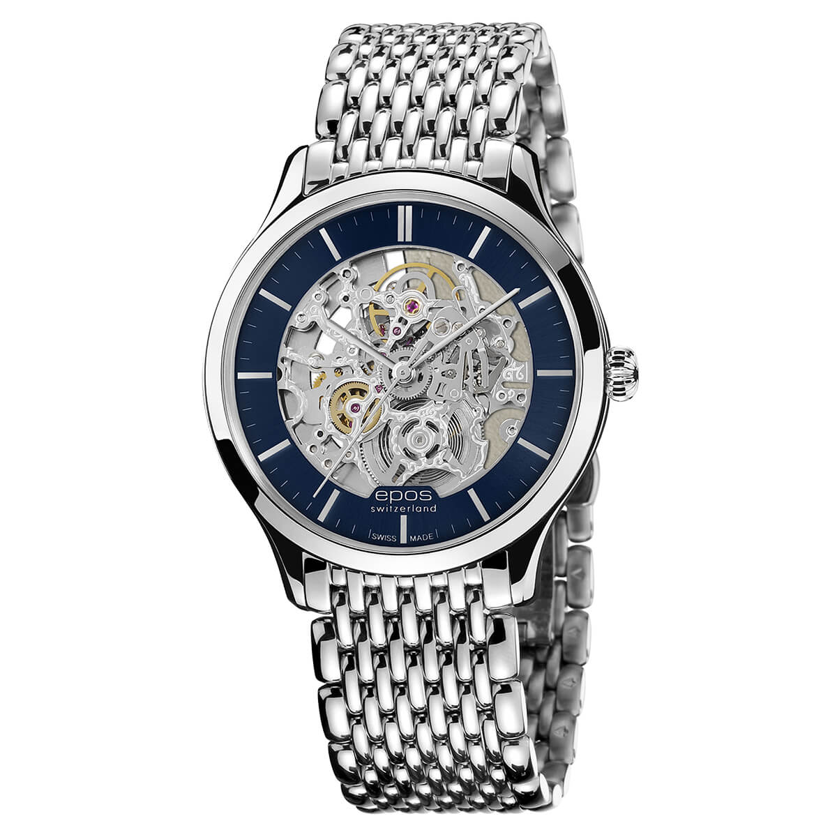 EPOS Originale Gent’s Blue Dial Stainless Steel Slimline Bracelet Automatic Skeleton Dress Watch 3420.155.20.16.30